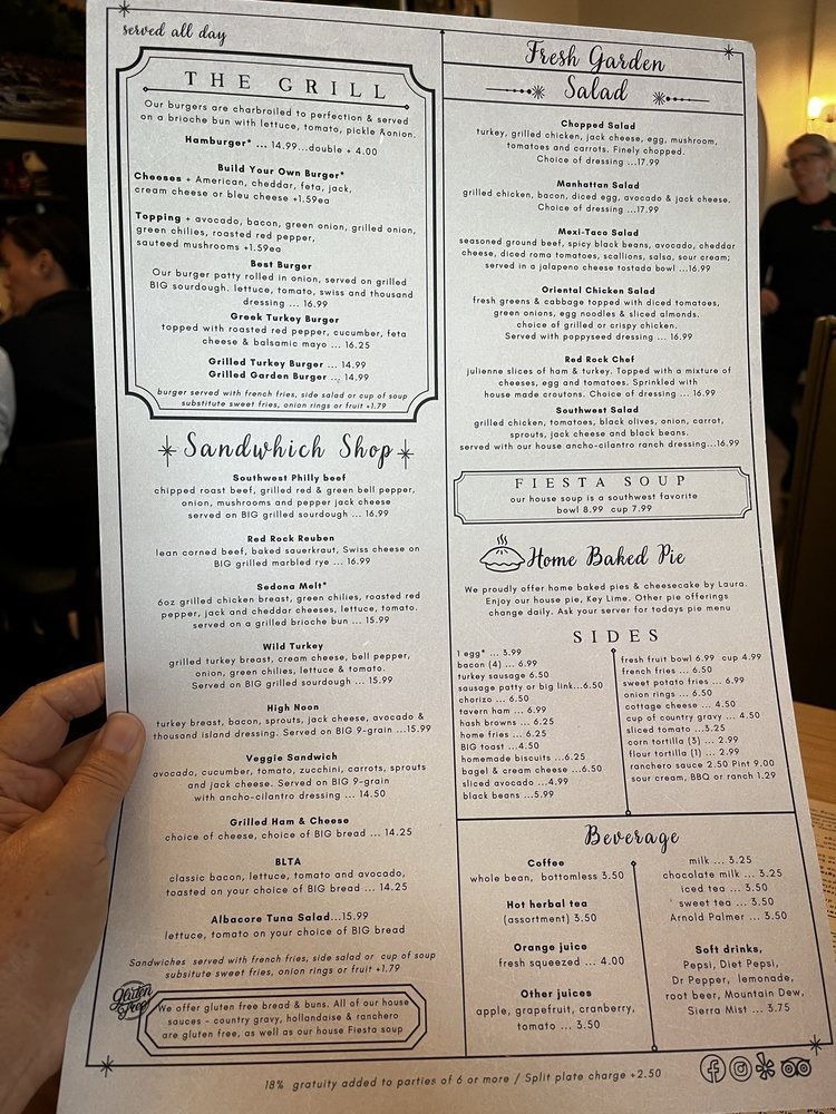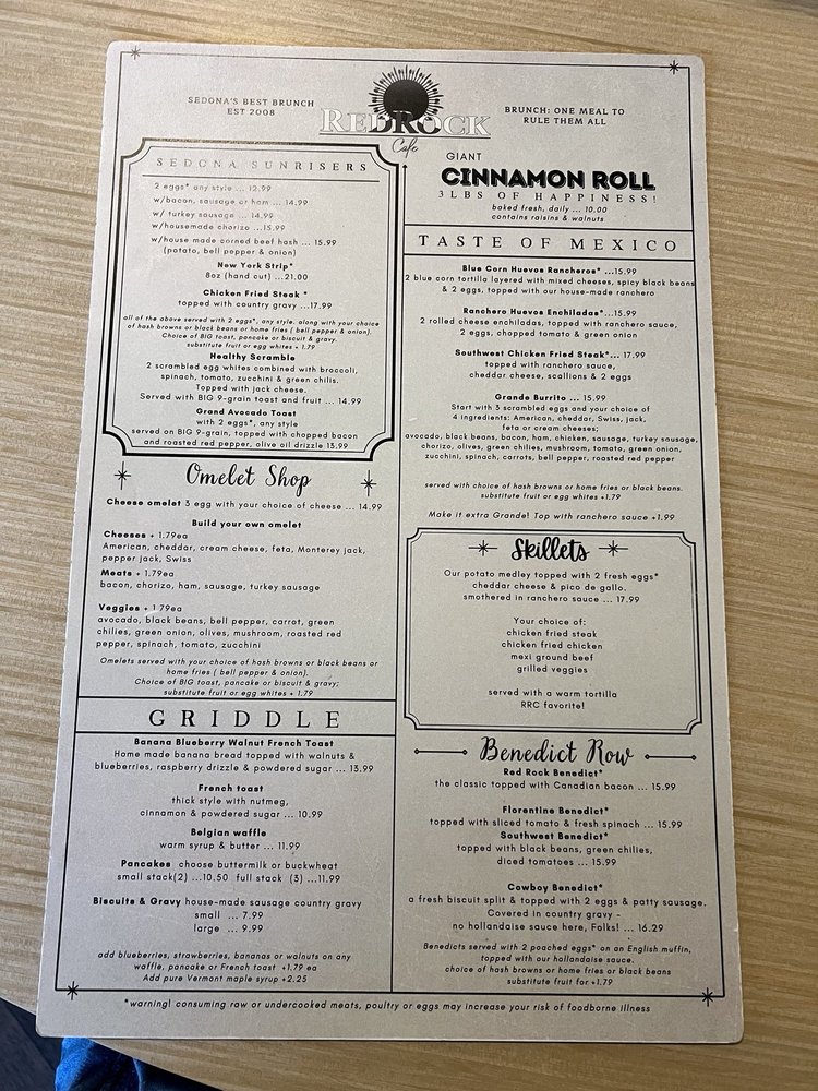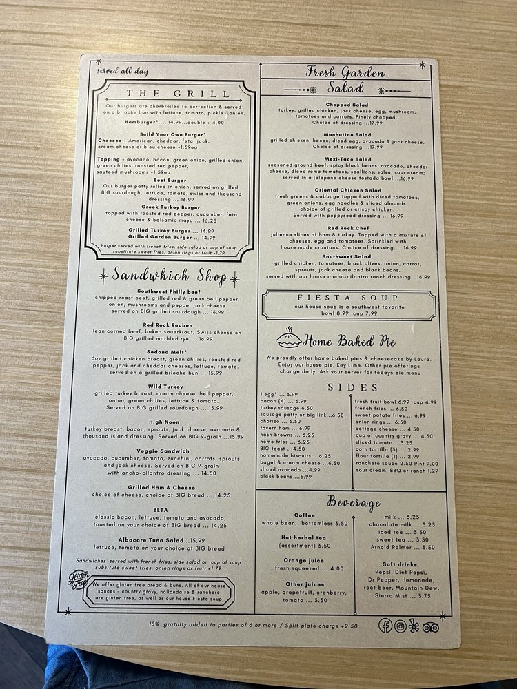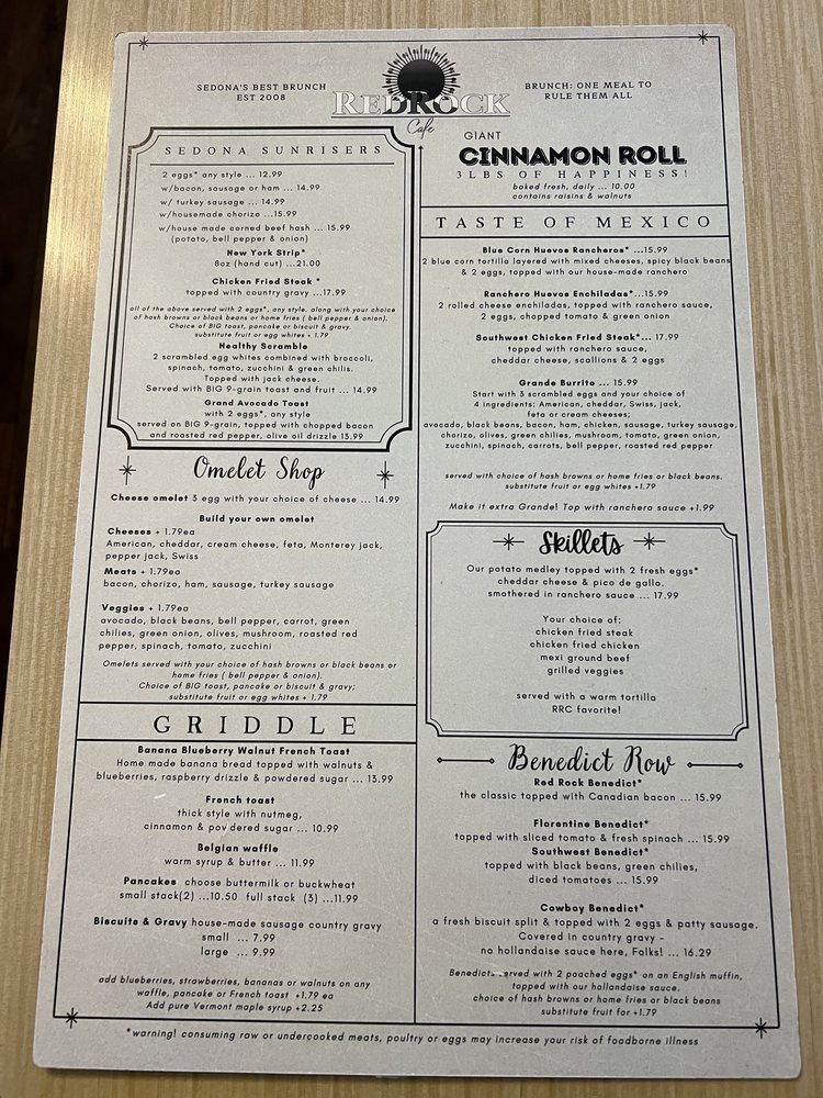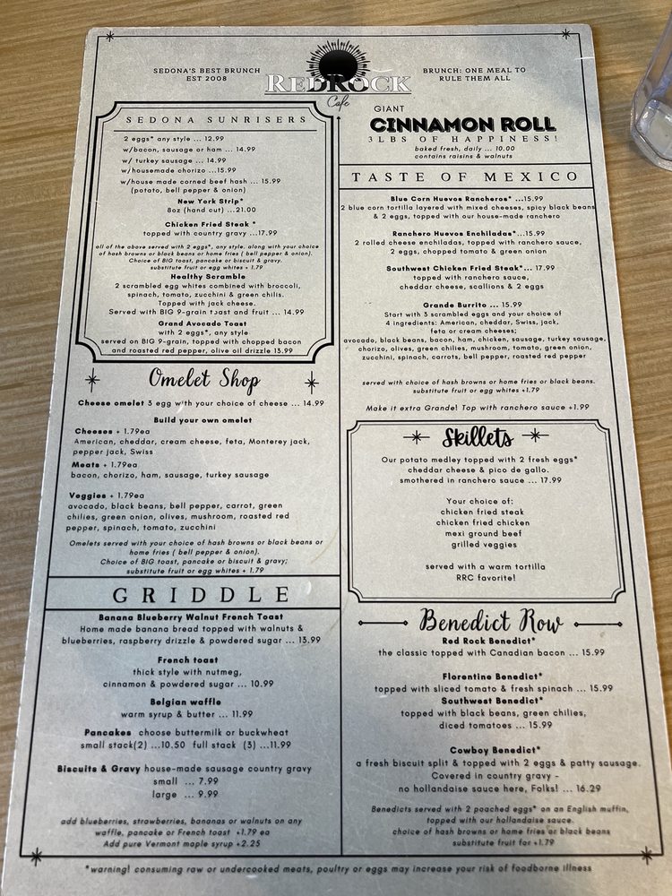 Introducing the menu at Red Rock Cafe, nestled in Sedona, AZ, offering a delightful blend of American, Mexican, Breakfast, and Brunch options. This women-owned restaurant provides a cozy atmosphere with outdoor seating and a full bar. Customers rave about the generous portions and reasonable prices. Highlights include the best chicken fried steak, homemade corned beef hash, and delicious huevos rancheros. The friendly staff, quick service, and varied menu options make it a must-visit spot for locals and tourists alike. Don't miss out on their famous Bloody Mary and vegan-friendly dishes. Whether you're looking for a hearty breakfast, a leisurely brunch, or a casual lunch, Red Rock Cafe is sure to exceed your expectations. Visit today and experience the charm and flavor that keeps customers coming back for more.